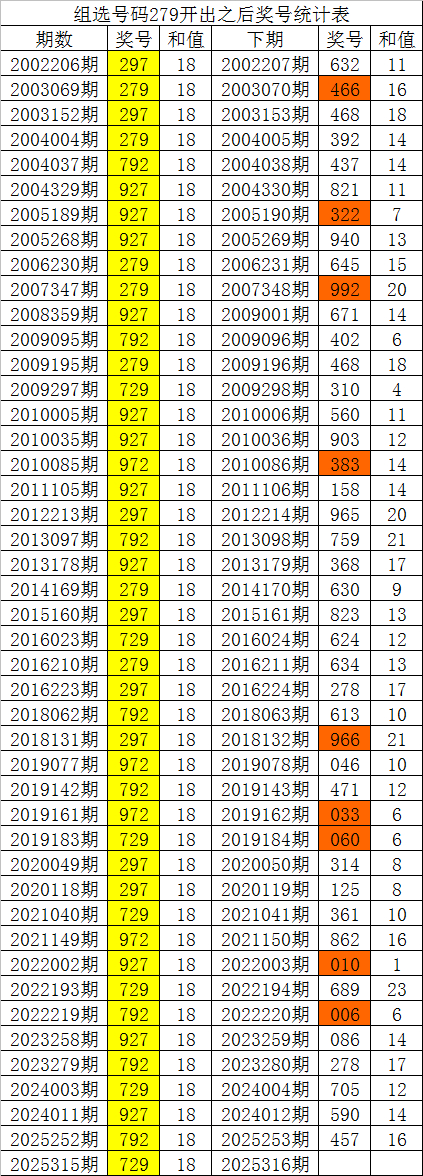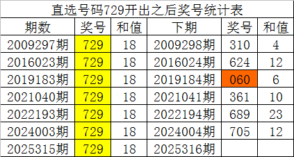 福彩3D第2025315期开出直选号码为:729,该直选号码历史上出现了7次,其下期分别开出了号码:310、624、060、361、689、705,如图: